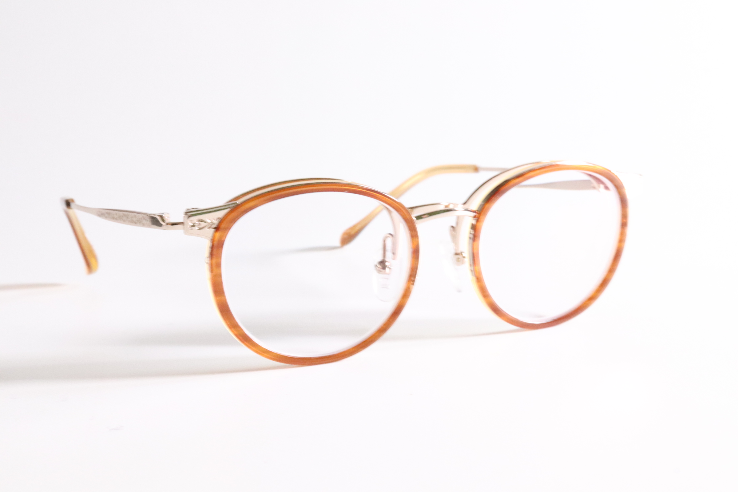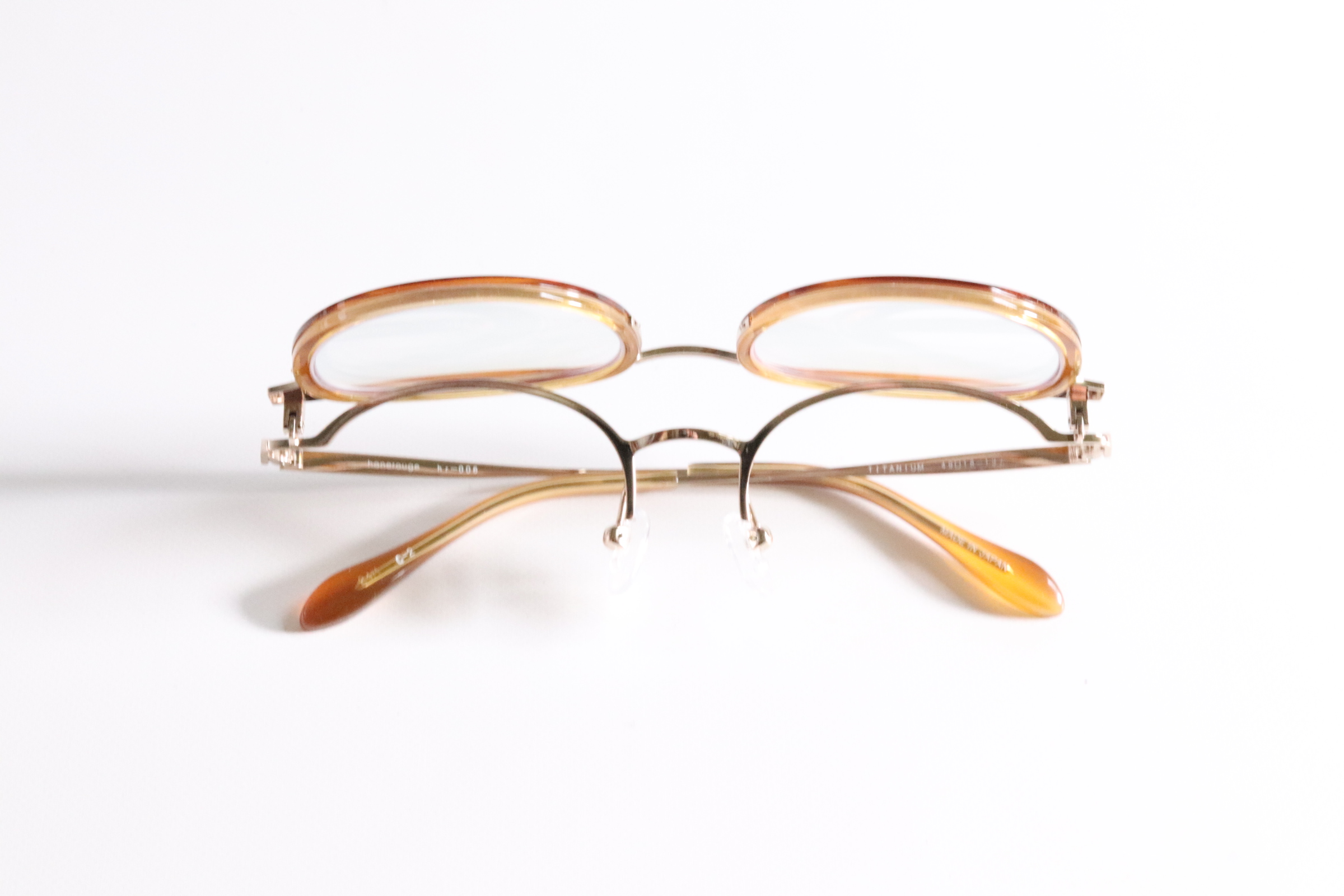 蝶番タイプのシンプルな跳ね上げ構造です。フロントのチタン枠の裏に蝶番が隠れる為、跳ね上げメガネとはわかりません。