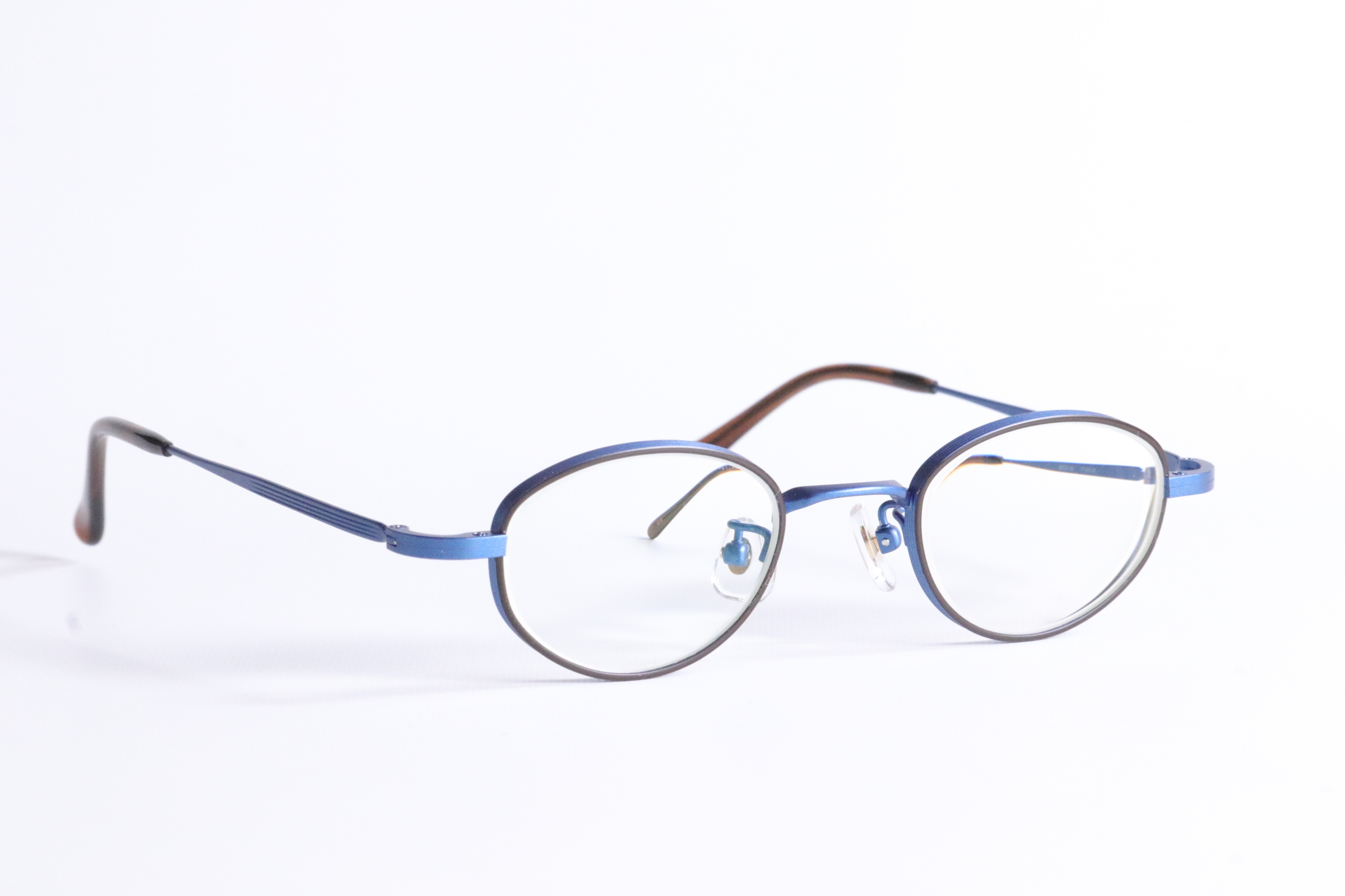 ブルーとブラックのコントラストが印象的なメタルフレーム。シャープな色使いが、顔立ちを引き締め、知的で洗練された印象を演出します。