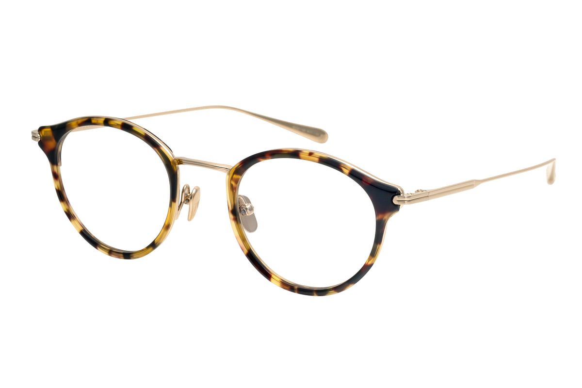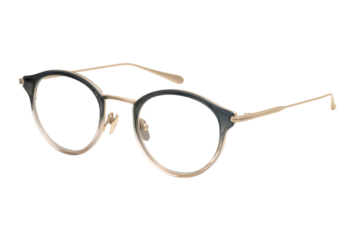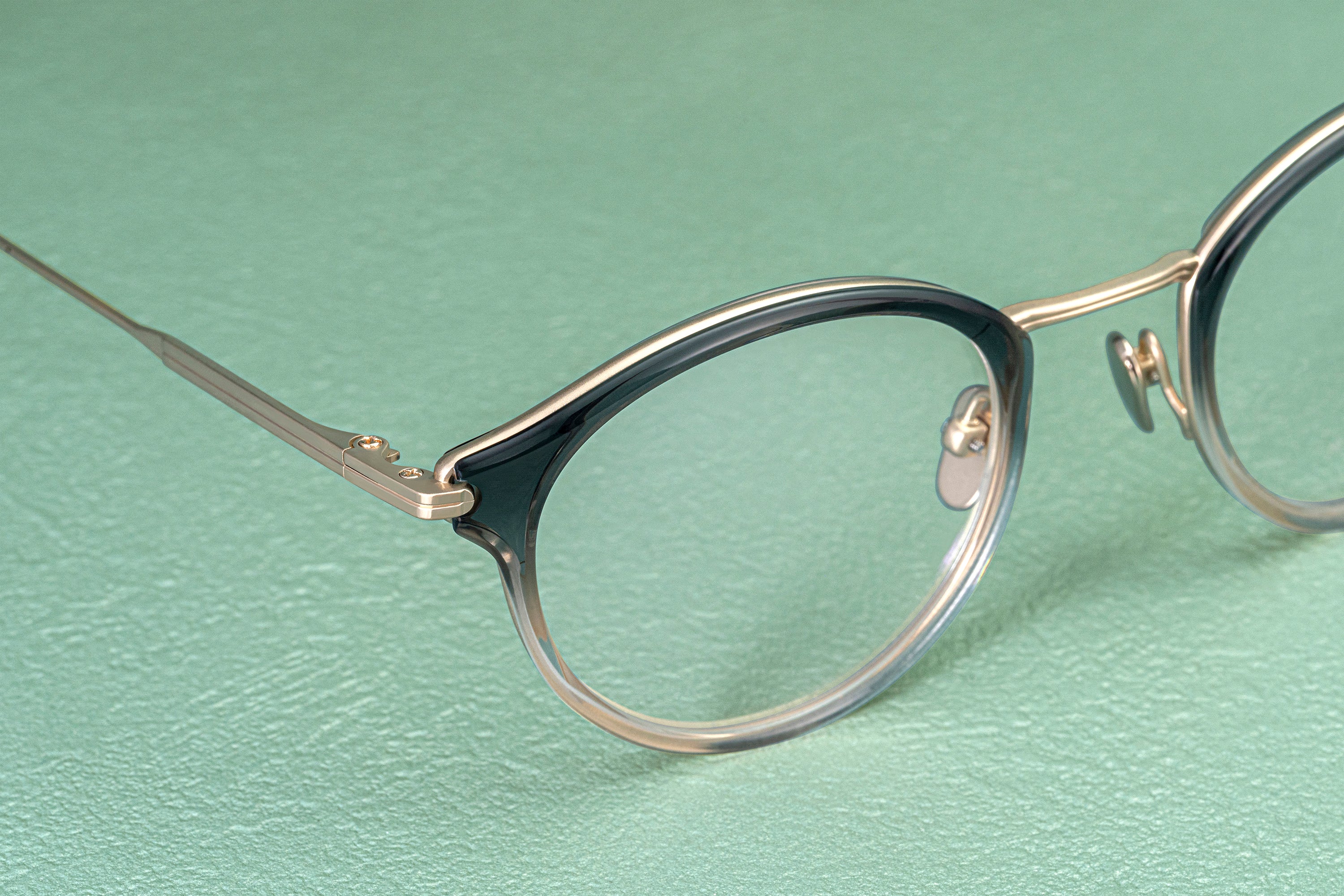 アイコニックなボストンシェイプのプラリムは独自のカッティングで軽快な印象に。#38 MOSS/GPはグレーのグラデーション生地を採用。重すぎないカラーリングで肌馴染みがよく、ヨロイ部のゴールドがアクセントかつ全体を引き締めます。
