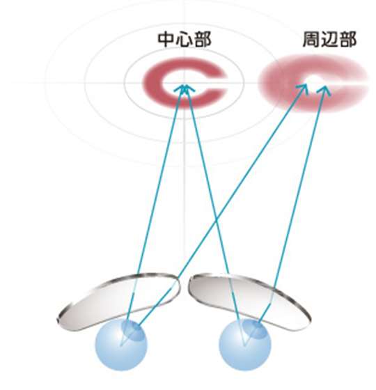 フレームそり角によるプリズム自動補正。そり角の大きい「SPORTSフレーム」に度つきレンズを入れてかけると、周辺視野では左右眼視線方向にずれが生じます。 HOYA「NULUX RF SPORTS」は「明瞭さ」と「左右眼視線ズレ補正」の両方の最適バランスを追求した世界初のシングルビジョンレンズです。