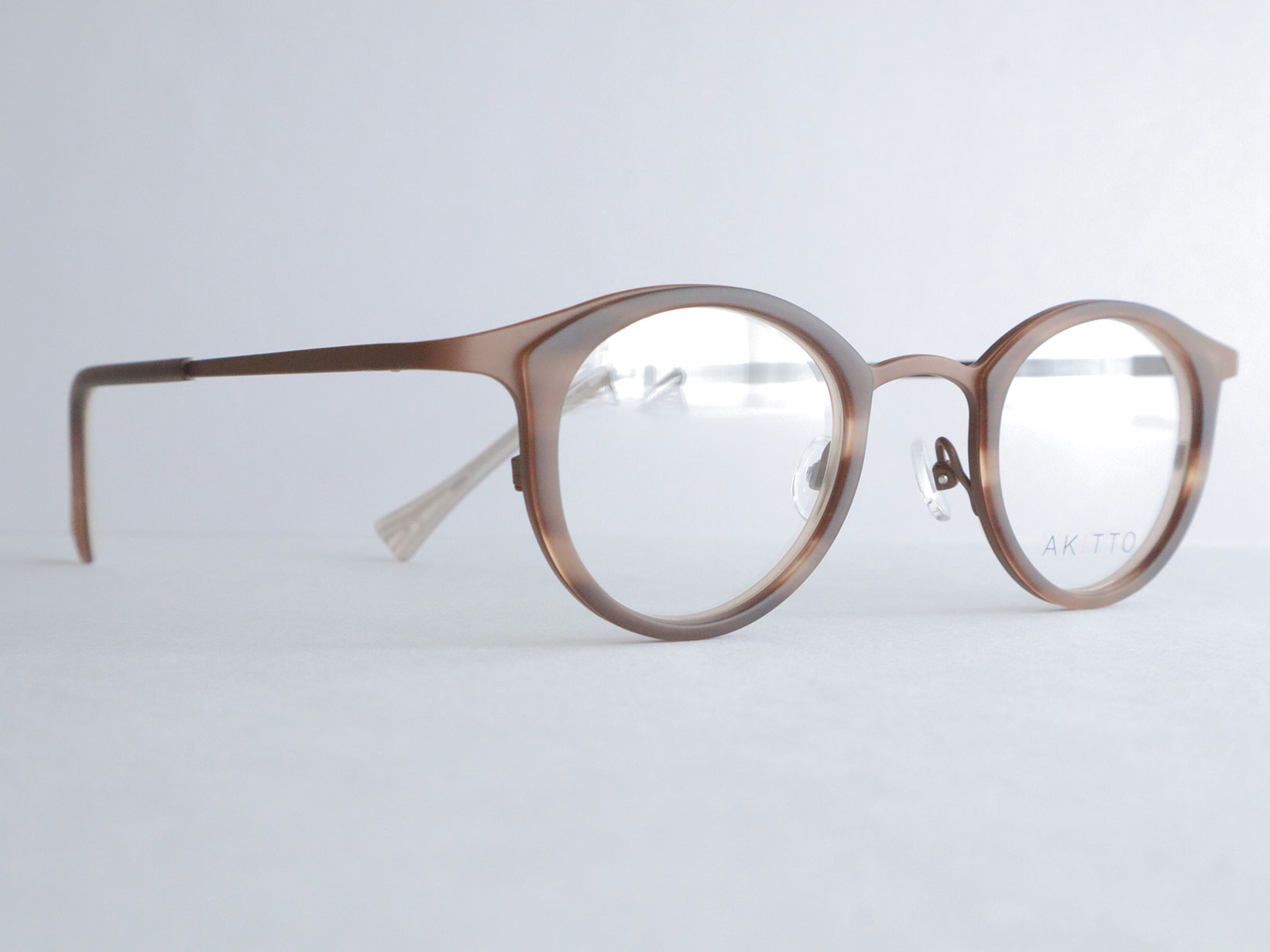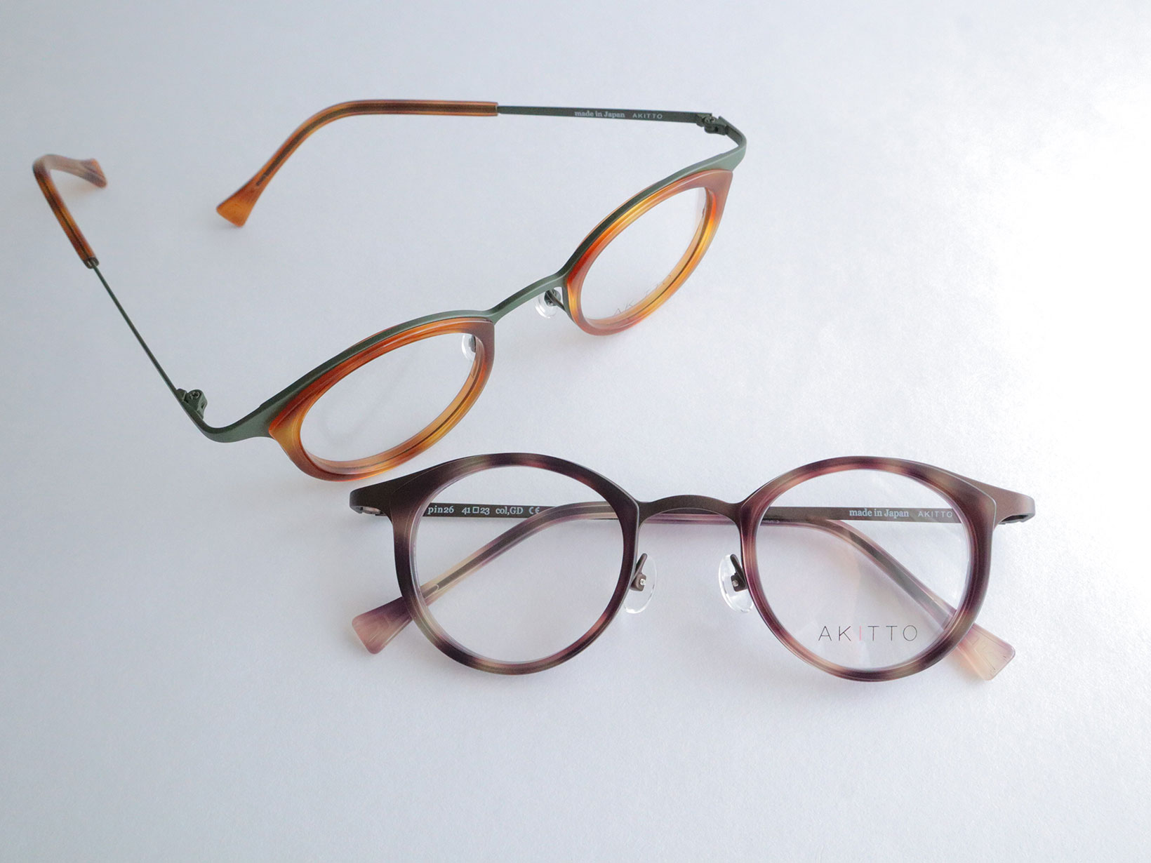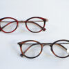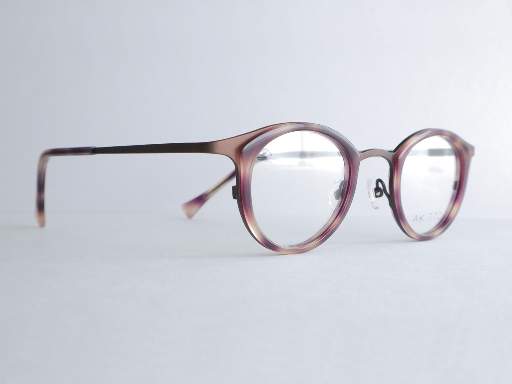 pin26シリーズは、繊細なラインと奥行きのあるカラーリングが特徴。フロントのセルが表情にやさしい印象を与え、チタンテンプルが軽やかな掛け心地を支えます。