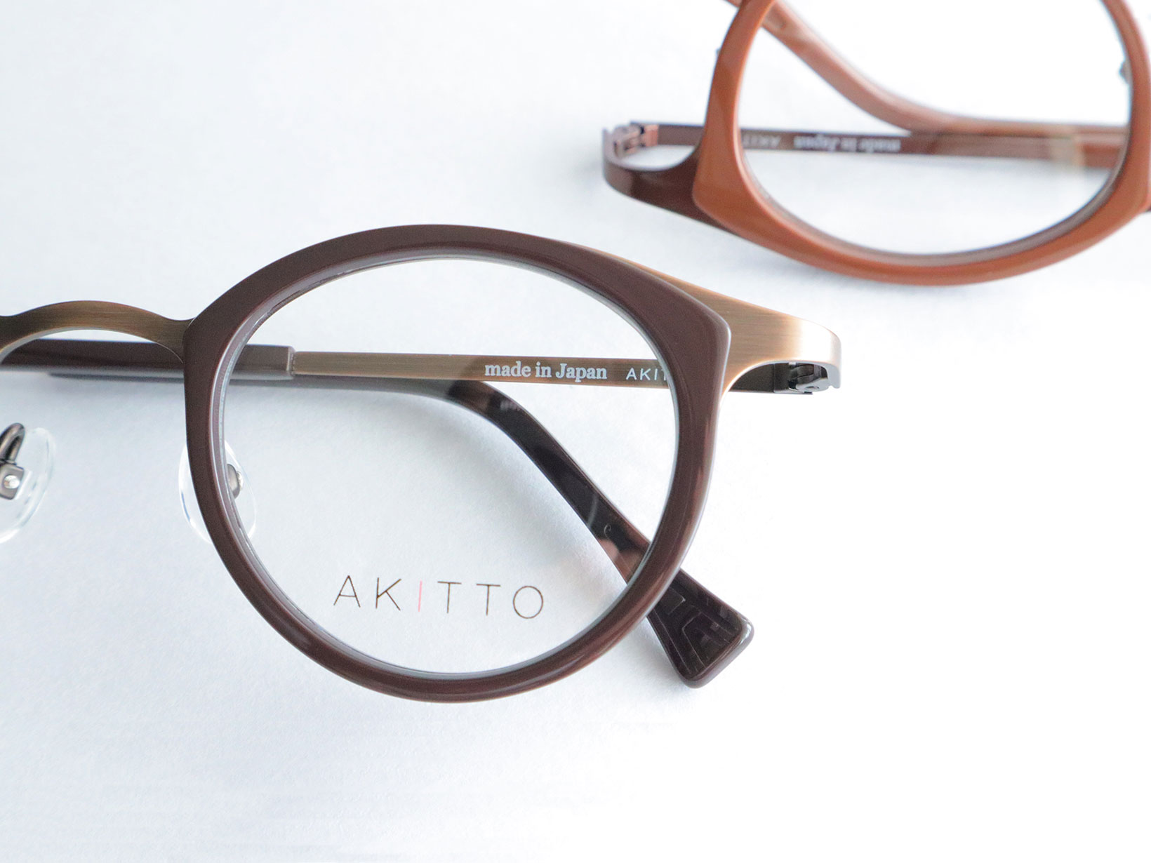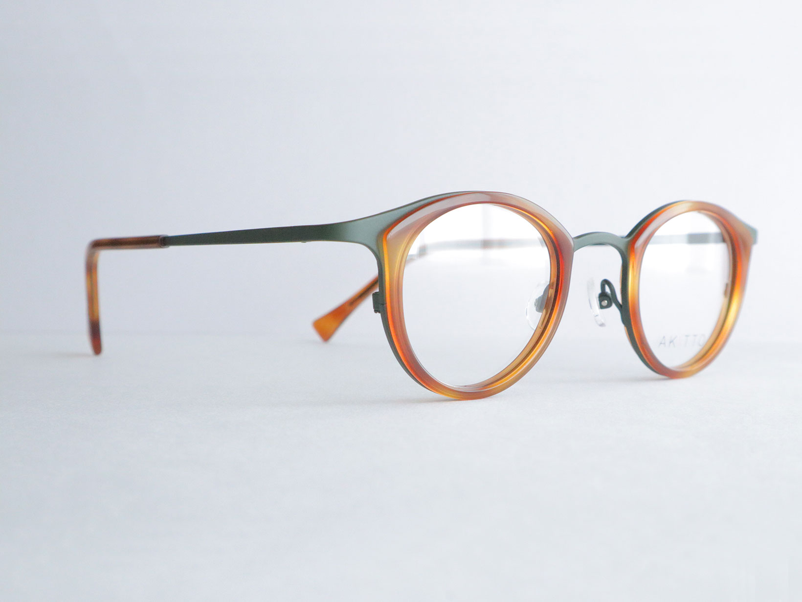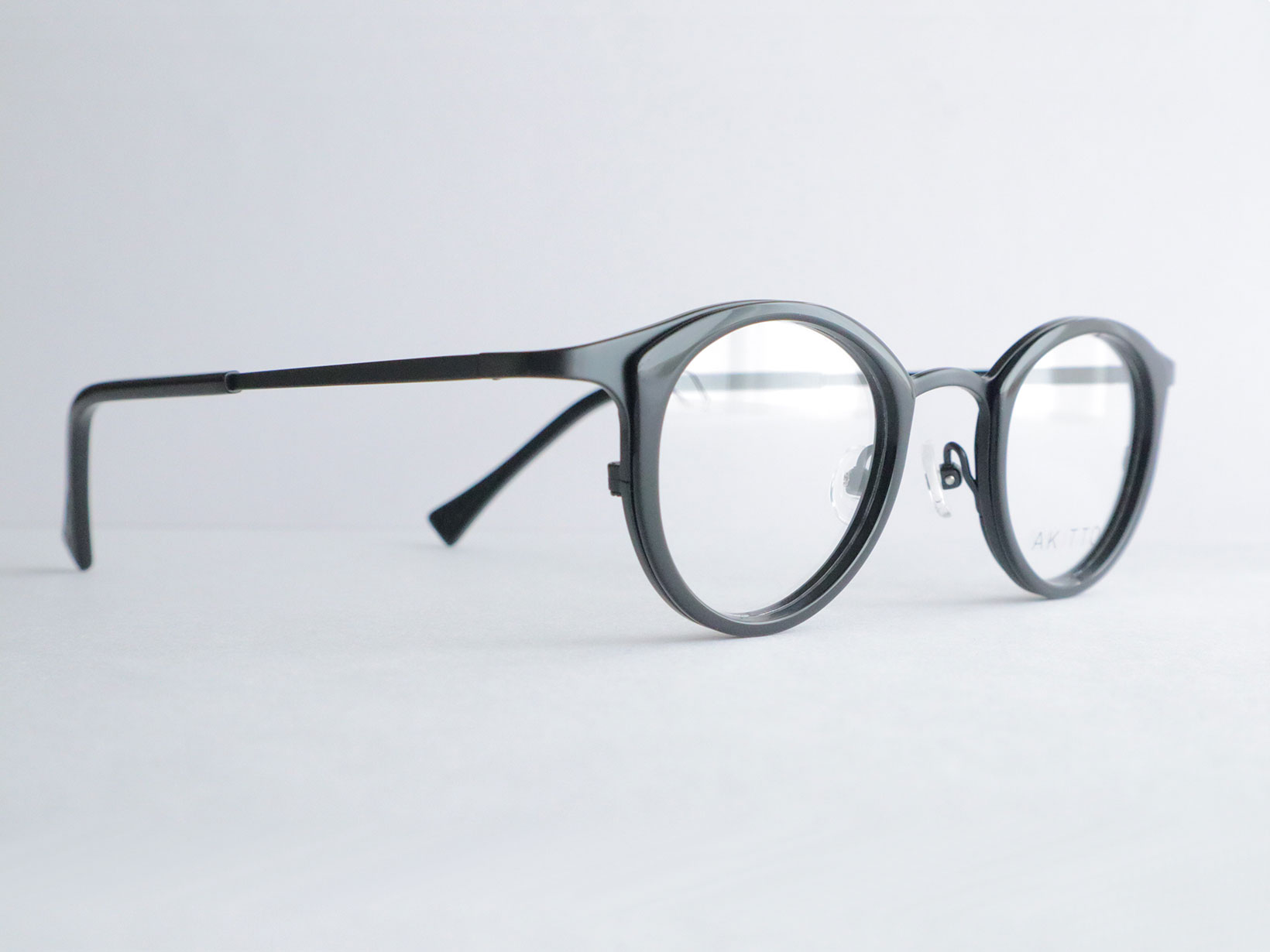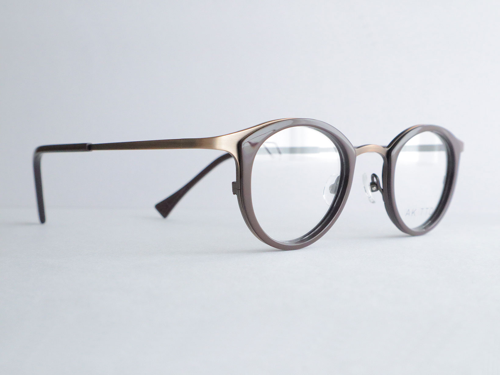 pin26シリーズは、繊細なラインと奥行きのあるカラーリングが特徴。フロントのセルが表情にやさしい印象を与え、チタンテンプルが軽やかな掛け心地を支えます。