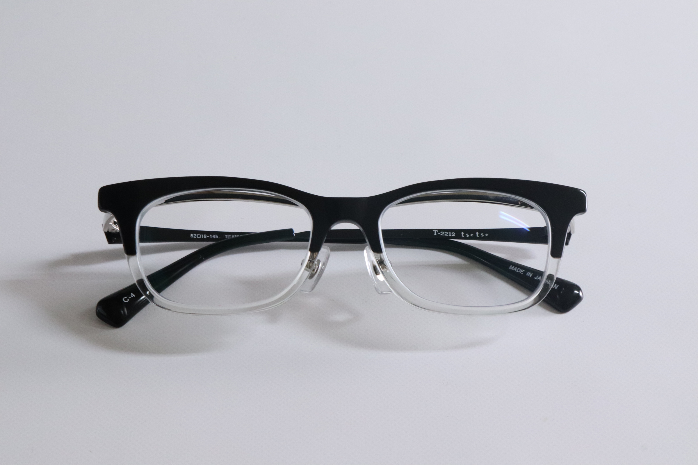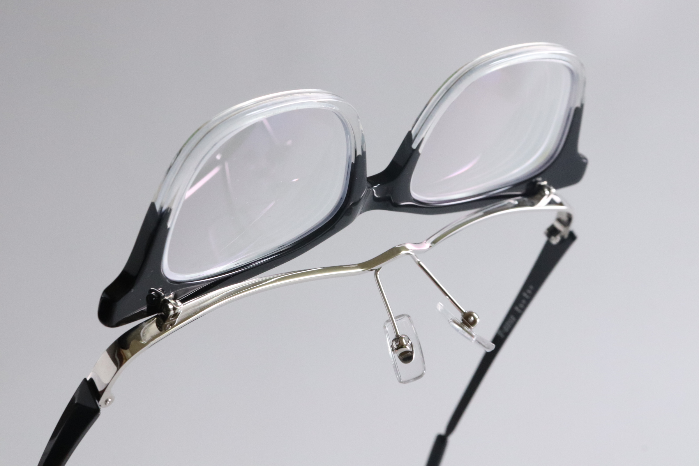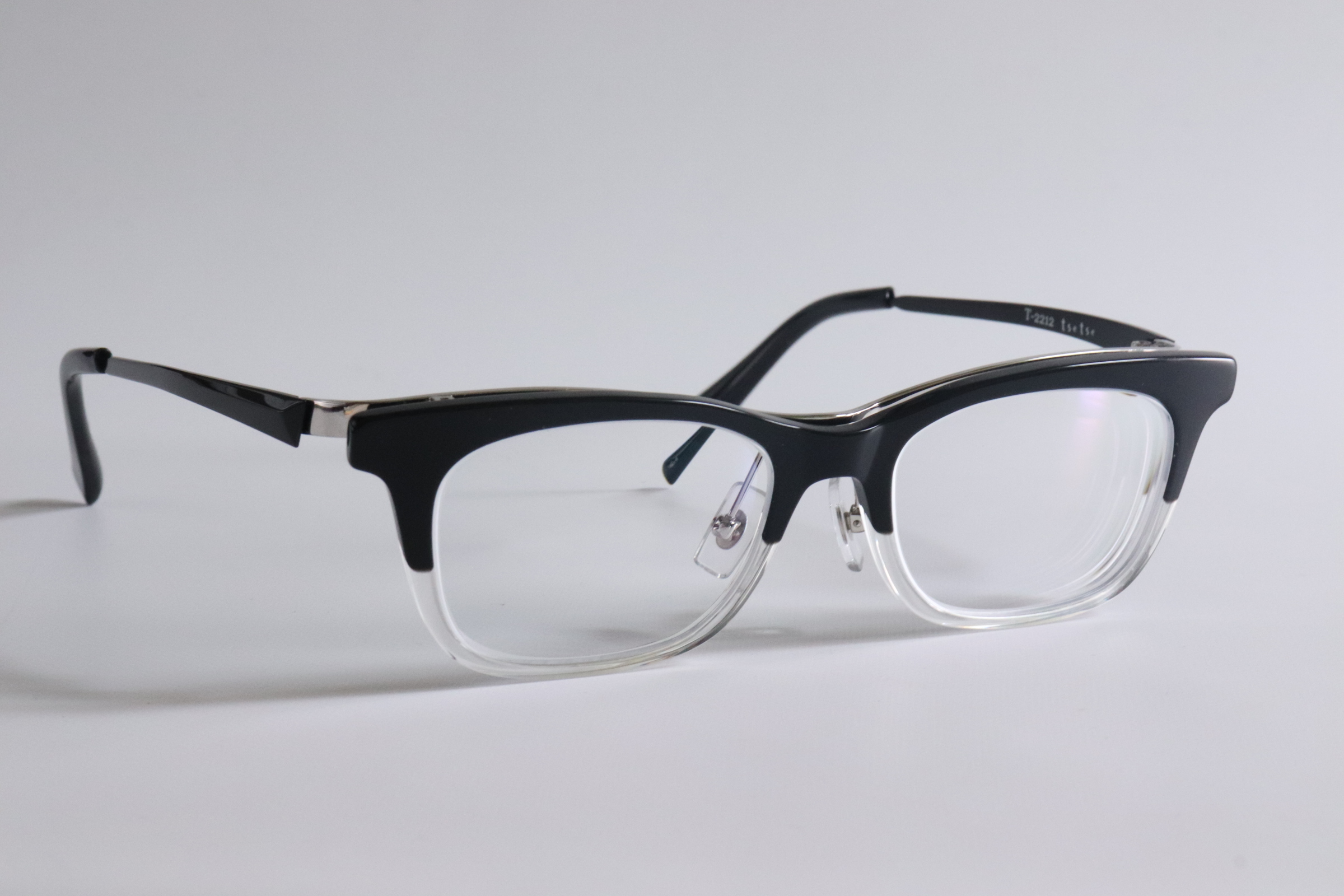 デザインは、ブラックハーフのセルフレーム。上部のブラックが表情を引き締め、下部のクリア感が重さを軽減します。
