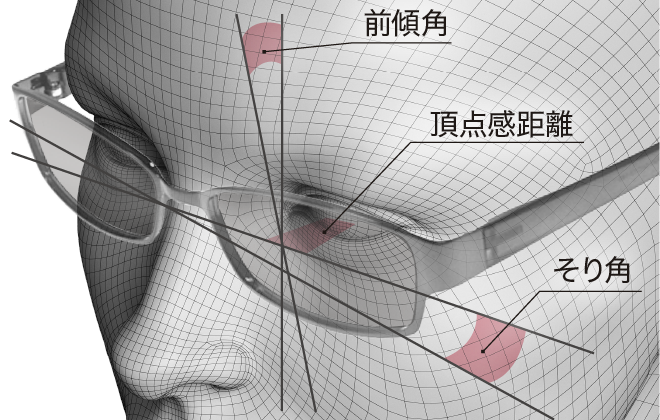 そり角・前傾角・頂点間距離を測定することで得られる目とレンズの立体的位置関係をレンズ設計に反映し最適化していきます。